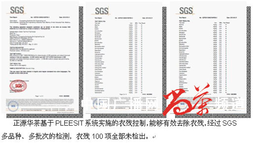 正源華茶基于PLEESIT系統(tǒng)實(shí)施的農(nóng)殘控制,能夠有效去除農(nóng)殘,經(jīng)過SGS多品種、多批次 的檢測(cè),農(nóng)殘100項(xiàng)全部未檢出。