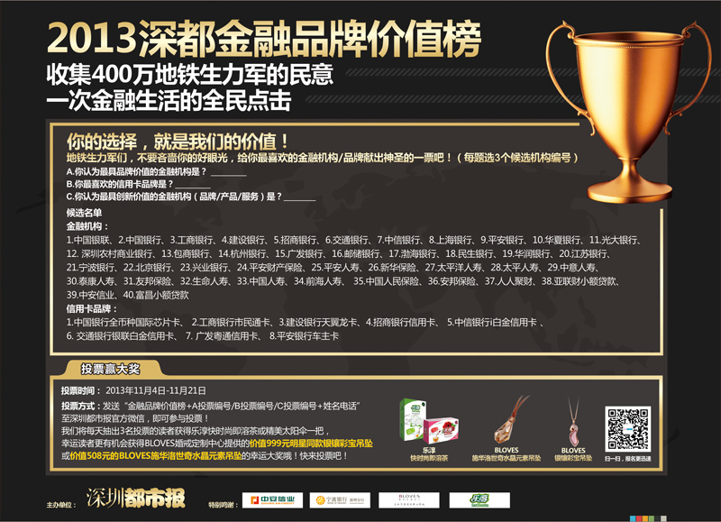 由《深圳都市報(bào)》主辦,正源華茶全力支持的2013深都金融品牌價(jià)值榜評(píng)選活動(dòng)在11月1日拉開(kāi)帷幕,本次活動(dòng)為期一個(gè)月,通過(guò)深圳都市報(bào)、網(wǎng)絡(luò)等多種形式,邀請(qǐng)深圳400萬(wàn)乘坐地鐵生力軍參與評(píng)選,共同見(jiàn)證本年度金融機(jī)構(gòu)的創(chuàng)新碩果。